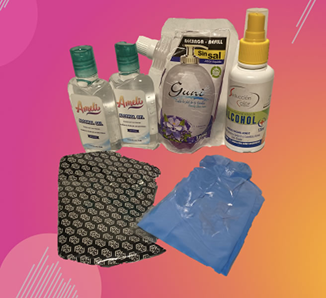 Gel antiséptico de 140 ml – Jabón líquido 125 ml – Alcohol 120ml – Un par de guantes de nitrilo